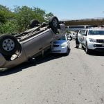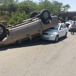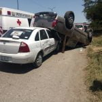 Fue tal la fuerza del impacto que la camioneta dio una voltereta, quedando arriba del auto compacto.