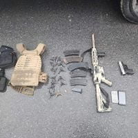 Al interior de la unidad se logró asegurar un teléfono celular, un arma corta, un cargador, un arma larga, cinco cargadores, un chaleco táctico, una pernera táctica y 14 artefactos metálicos conocidos como “ponchallantas”.
