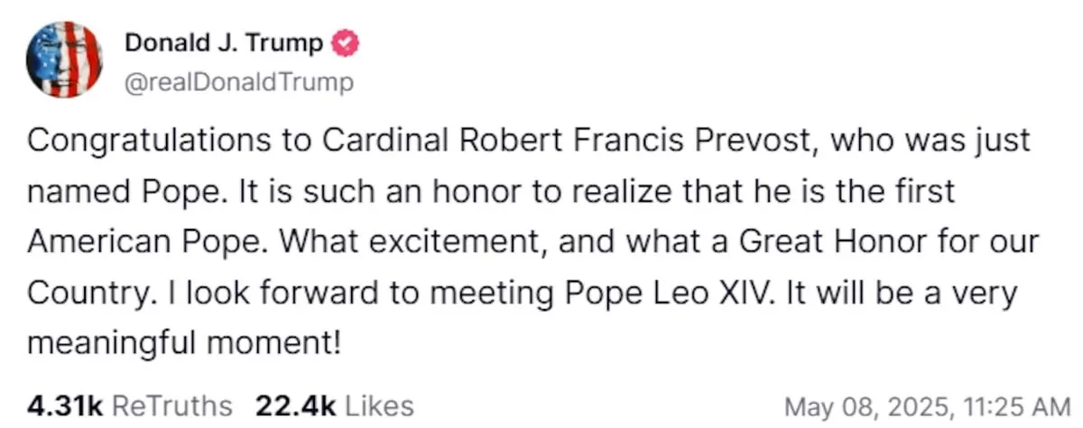 A través de su red social Truth Social, el mandatario felicitó al religioso y destacó la relevancia histórica del nombramiento.