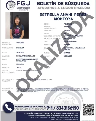La Vocería de Seguridad de Tamaulipas confirmó la localización con vida de Estrella Anahí Pérez Montoya, joven de 22 años que había sido reportada como desaparecida el pasado 26 de julio en Ciudad Victoria.