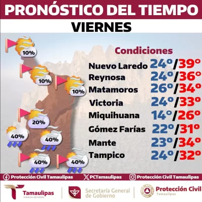 Protección Civil Tamaulipas informó que este viernes predominará un ambiente caluroso y bochornoso, con sensaciones térmicas de 38° a 42°, acompañado de un evento de “Surada” con ráfagas de viento entre 35 y 55 km/h.