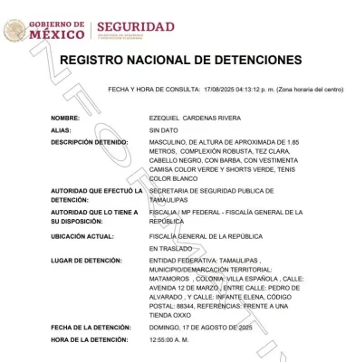 El Registro Nacional de Detenciones señala que Ezequiel “N” mide alrededor de 1.85 metros, es de complexión robusta, tez clara, cabello negro y barba. Al momento del arresto vestía camisa y shorts verdes, además de tenis blancos.