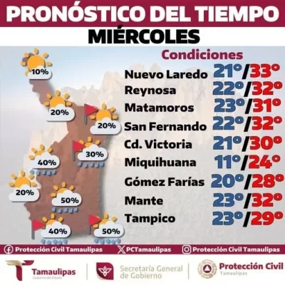 Las temperaturas máximas oscilarán entre los 29 °C y 33 °C, destacando valores más altos en Nuevo Laredo (33 °C) y Reynosa y San Fernando (32 °C), mientras que Miquihuana registrará las más bajas, con mínima de 11 °C y máxima de 24 °C.