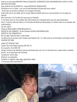 La desaparición de dos hombres y una mujer de Allende, Nuevo León, ha generado gran preocupación entre sus familiares, luego de que viajaran a Reynosa, Tamaulipas, para recoger un tráiler y desde entonces se perdiera toda comunicación con ellos.