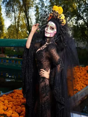 En las imágenes publicadas en sus redes sociales, Maribel luce un vestido del diseñador Mitzi, adornado con encaje, un velo negro y detalles que realzan su elegancia y figura. El maquillaje, en tonos rosados y violetas, completó el look que sus seguidores calificaron como “la Catrina más bella y elegante del año”.