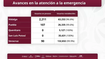 Por su parte, la Comisión Federal de Electricidad (CFE) informó avances significativos en la restauración del servicio eléctrico: 96.6% en Hidalgo, 99.6% en Puebla, y 100% en Querétaro y San Luis Potosí, mientras que en Veracruz el restablecimiento alcanza el 99.9%.