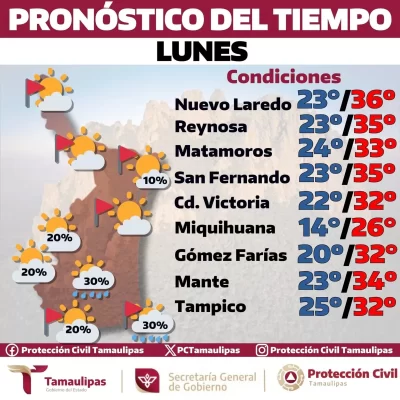 Durante la jornada se esperan temperaturas máximas que oscilarán entre los 32 y 36 grados en la mayor parte del territorio. Las regiones de Nuevo Laredo, Reynosa y San Fernando alcanzarán hasta 36 °C, mientras que en la zona sur, Tampico reportará máximas de 32 °C, al igual que Ciudad Victoria y Gómez Farías.