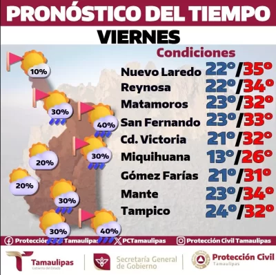 Para este viernes, se espera un ambiente agradable por la mañana en gran parte del estado, con temperaturas cálidas durante la tarde, aunque sin condiciones de bochorno extremo. De acuerdo con el pronóstico de Protección Civil Tamaulipas, las temperaturas máximas oscilarán entre 26 °C y 35 °C, dependiendo de la región.