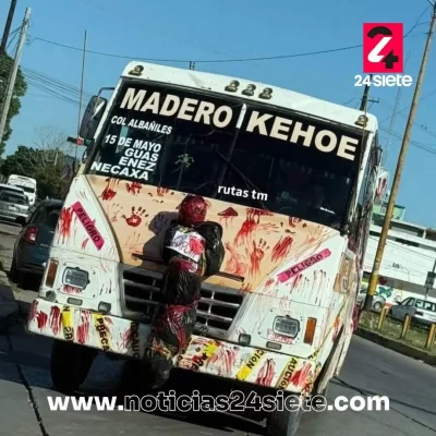 Con manos ensangrentadas, huellas, pintura roja y un muñeco colgante en el frente del camión, el vehículo se transformó en una auténtica “unidad del miedo”, generando decenas de reacciones en redes sociales.